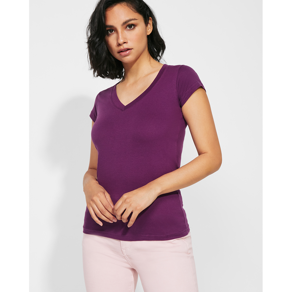 Dámské triko s krátkým rukávem a výstřihem do V. Vypasovaný střih s bočními švy.
